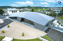 鉄骨平屋建て、延床面積は1,784平方メートルで自然と調和するよう屋根を山形とし、内部には県産杉材などを使用しています。