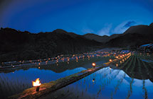 日本棚田百選に認定されている竹地区。この日、水をはった棚田に約1,200本の手作りトーチを燈します。無数の灯りが棚田の水面に反射してつくりあげる幻想的な風景は必見。周辺では蛍の乱舞も見られます。ステージイベントや出店などもあります。足元が暗いので、懐中電灯をもってお越しください。