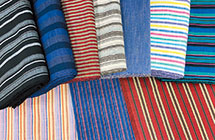 領主加藤嘉明が伊予松山から織師を招いて伝習したのが起源といわれています。厚手で丈夫な生地は、保湿性・吸水性に優れ、普段着、日常着などに使われてきました。美しい縞模様は、かつて「地縞(じじま)」と呼ばれ、時代ごとに新しい色やデザインが加えられ、現在では洋服や小物・雑貨など幅広く活用されています。